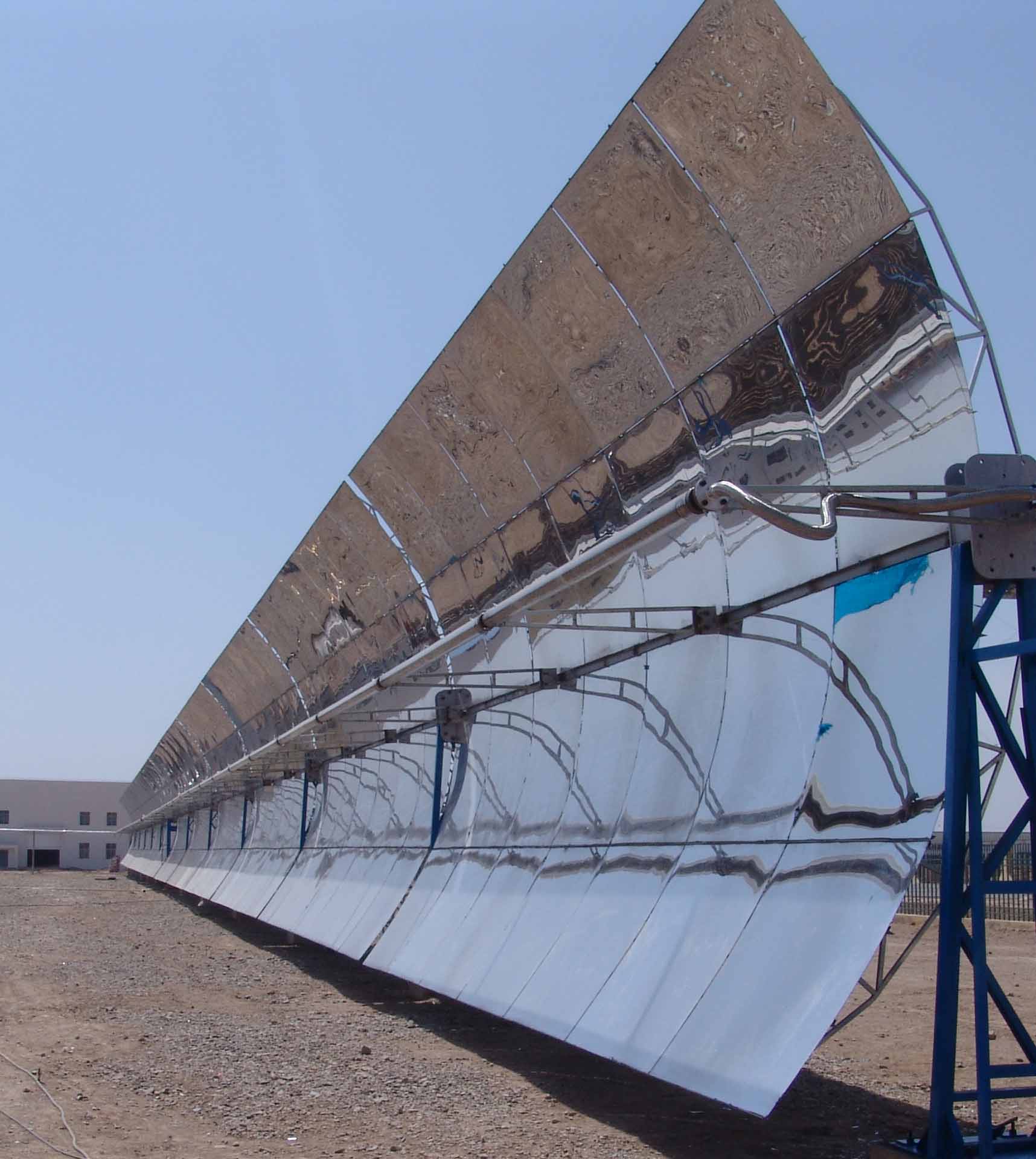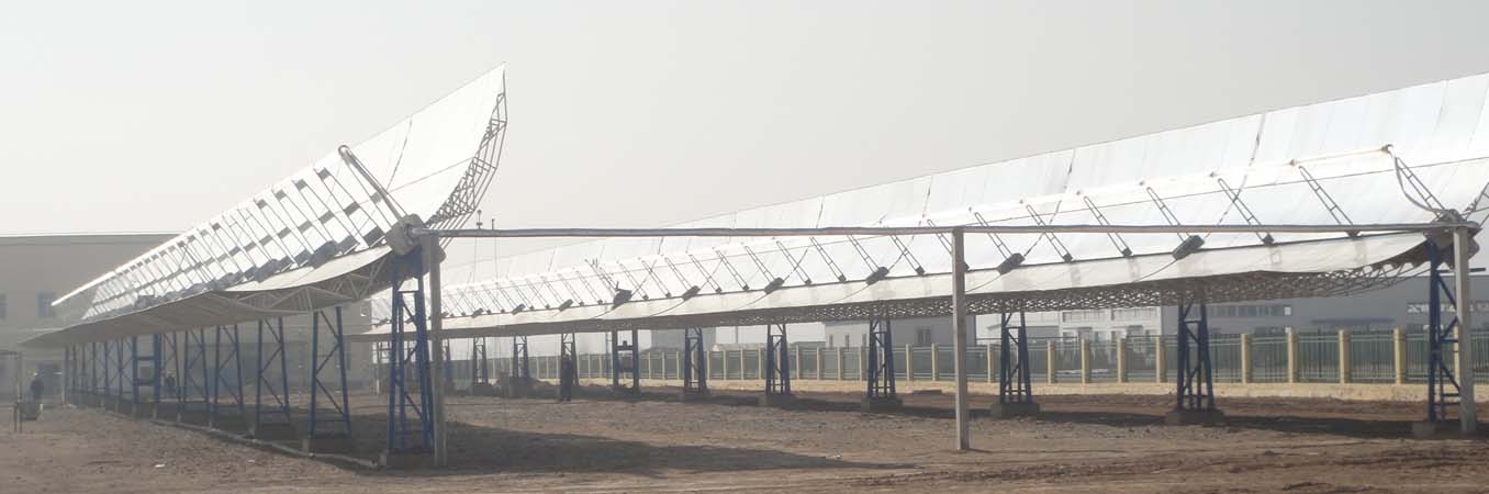 槽式太阳能集热系统是将多个线性抛物面聚光器经过串并联的排列,汇聚太阳直射光,加热真空集热管中的工质,产生高温。可用于太阳能光热发电,也可以广泛地应用于建筑采暖、太阳能空调、纺织、印染、造纸、海水淡化、食品加工等需要蒸汽热能的工业和民生领域。联盟研制的槽式太阳能集热系统已于2011年6月组装完成,在试机过程中产生温度为320℃,压力为25kg。